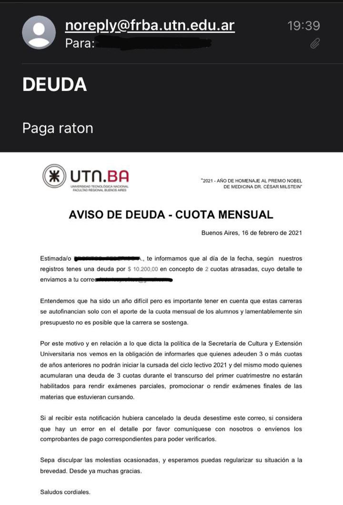 Lo que era una broma interna entre programadores de software terminó siendo una falta de respeto para cientos de estudiantes que se volvió viral en las últimas horas. Y es que quienes adeudan el pago de una cuota o más en la tecnicatura en Gestión Aeronáutica de la Universidad Tecnológica de Buenos Aires (UTN) se encontraron con un mail automático con un mensaje nada serio: “Pagá ratón”.