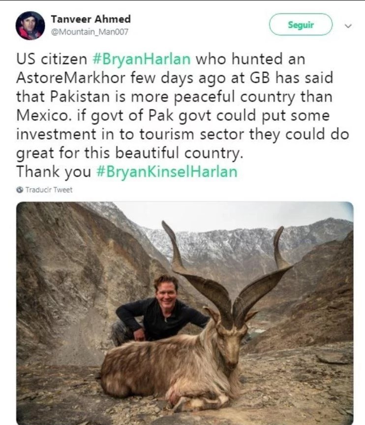 Bryan Kinsel Harlan, de Texas, quedó en el ojo de la tormenta tras matar a una cabra montesa de la especie Astor Markhor, que está en peligro de extinción. El hombre tuvo que pagar 110 mil dólares para que las autoridades de Pakistán le permitieran cazar en la región del Himalaya.