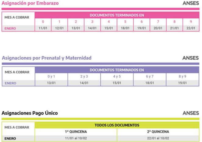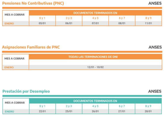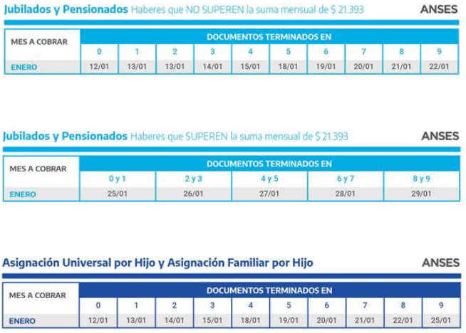 La ANSES informó los calendarios de pago del mes de enero para jubilados y pensionados, Pensiones No Contributivas, beneficiarios de la Asignación Universal por Hijo y por Embarazo, de la Prestación por Desempleo y Asignaciones Familiares y de Pago Único (Matrimonio, Nacimiento y Adopción).
