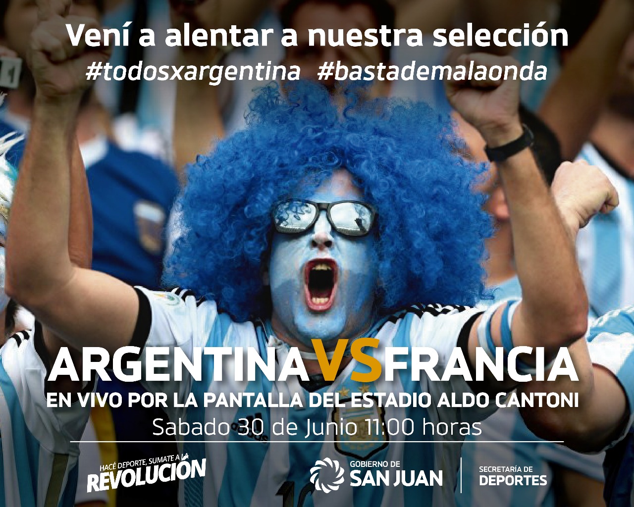 El próximo sábado a las 11, Argentina jugará con Francia por octavos de final de Rusia 2018 y para alentar a la Selección de Jorge Sampaoli, la Secretaría de Deportes organizó una movida donde habrá pantalla gigante en el estadio Aldo Cantoni para ver el partido.