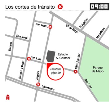 El choque mundialista comenzará a las 11, pero seguramente la intersección de Urquiza y San Luis se verá colmada de hinchas desde horas antes, especialmente si de contar con una buena ubicación se refiere. Los colores blanco y celeste inundarán un lugar tradicional del deporte sanjuanino. Ojalá sea para festejar tras el final del partido.