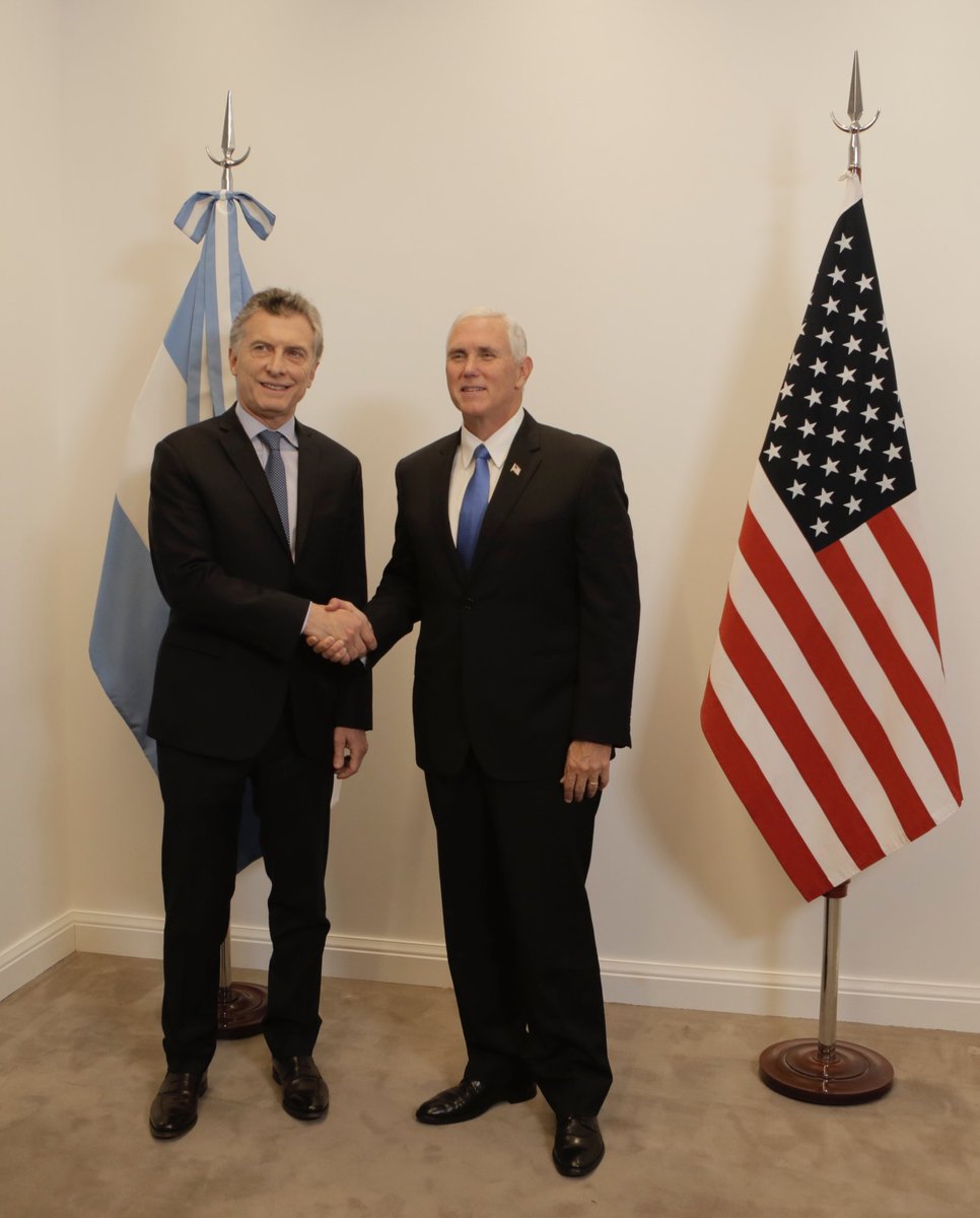Por su parte, Pence expresó que su visita a la Argentina busca “reforzar el lazo estrecho” entre ambos países, y felicitó a Macri por “sus audaces programas de cambio para transformar la economía del país y reinstalar su reputación en el mundo”, además de trasladarle los saludos de “su amigo de vieja data”, el presidente Donald Trump.