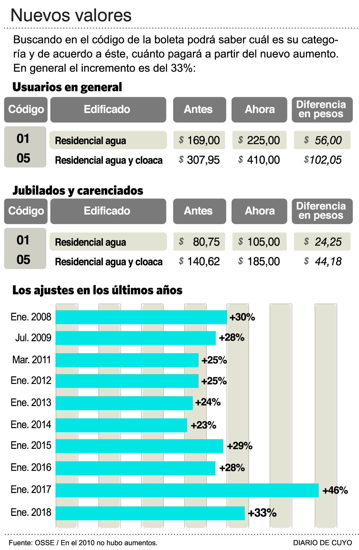 La tarifa de agua no escapó a la ola de incrementos de los servicios públicos en el comienzo del 2018 y 140 mil usuarios sanjuaninos que cuentan con el servicio de agua corriente y cloacas en la provincia, a cargo de Obras Sanitarias Sociedad del Estado; recibirán facturas con aumentos de hasta 33%. El 83% de los usuarios residenciales recibirán incrementos de entre $56 y $102,05, elevando la boleta más usual a $225 por mes para el hogar que cuente sólo con servicio de agua potable y a $410 si además tiene cloacas. La nueva tarifa rige desde el 1 de enero pero las remesas de boletas harán sentir su impacto recién en marzo, explicó Herman Salinas, gerente General de OSSE. Como es usual, el organismo mantendrá vigentes la tarifa social menor para los jubilados y carenciados, con subas promedio de 30%. En estos casos los aumentos serán de $24 para la primera escala y tendrán que pagar $105 por mes. Con el adicional de cloacas pasa a $185, es decir, $44 extra (ver infografía).