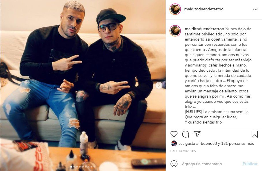 “Hace ocho años que no me afeitaba”, había dicho sonriente a Marcelo Tinelli, aunque en ese momento estaba caracterizado y su primera aparición ya sin máscara fue en Instagram, junto con su amigo y tatuador Ángel Santoni, que compartió la imagen.