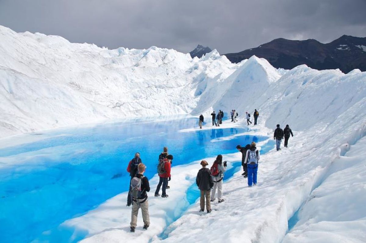 * Otra opción es la que lleva hasta el mismísimo Glaciar y desde allí, debidamente equipados con grampones (calzado con clavos,) para poder caminar sobre el hielo, se realiza una caminata sobre suelo irregular pero firme y si bien el recorrido es de nivel moderado, el cansancio se ve recompensado al terminar, con un copa de whisky con hielo del glaciar. Un detalle para tener muy en cuenta, esta excursión está vedada para menores de 14 años, mayores de 65 y embarazadas, y además del calzado especial para quienes hacen el trekking, se recomienda llevar un bastón que proveen las empresas turísticas, ropa abrigada y una vianda que en los mismos hoteles se encargan de preparar. Al regresar se impone una parada en el Restaurante del Glaciar, donde se puede saborear entre otras cosas, una exquisita cazuela de cordero con vino tanto, con el ingrediente de una espectacular vista de la cara norte del glaciar.