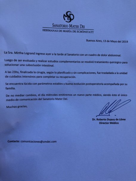 Según informó el sanatorio Mater Dei en el que la diva de los almuerzos se encuentra internada, Mirtha está "lúcida con parámetros estables, presenta una buena evolución postoperatoria y se encuentra acompañada por su familia".