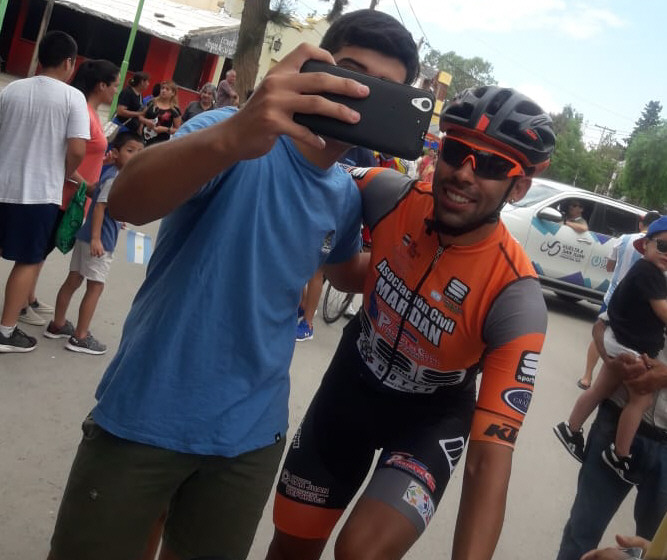 Apoyo local. Laureano Rosas, ciclista de Mardan, junto a Tivani y Escuela fueron de los más buscados por los jachalleros para las fotos previo a largar.