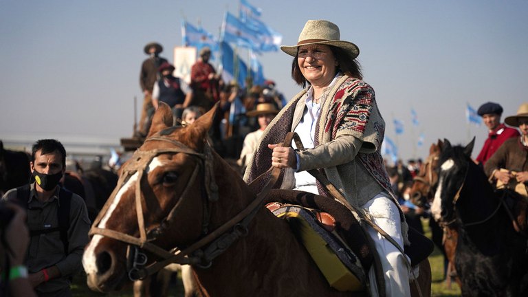 Aunque se había remarcado que el acto que realizan productores y trabajadores autoconvocados del campo en San Nicolás sería multisectorial y no impulsado por partidos políticos, la presidenta del PRO, Patricia Bullrich, apareció en escena con poncho y a caballo. “Vengo como una persona común, no como dirigente política”, aclaró la ex ministra de Seguridad durante el gobierno de Mauricio Macri.