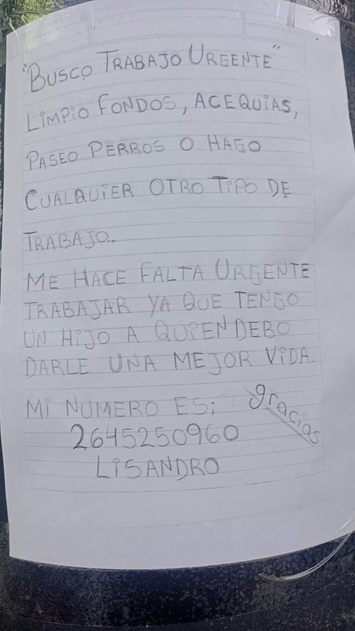 Con ese encabezado, Lisandro tal como firmó el pedido escribió con puño y letra que limpia fondos, acequias, pasea perros o "hago cualquier otro tipo de trabajo". En ese comunicado, donde dejó su número de celular para que lo contacten, explicó que le hace falta "urgente" trabajar, ya que tiene un hijo.