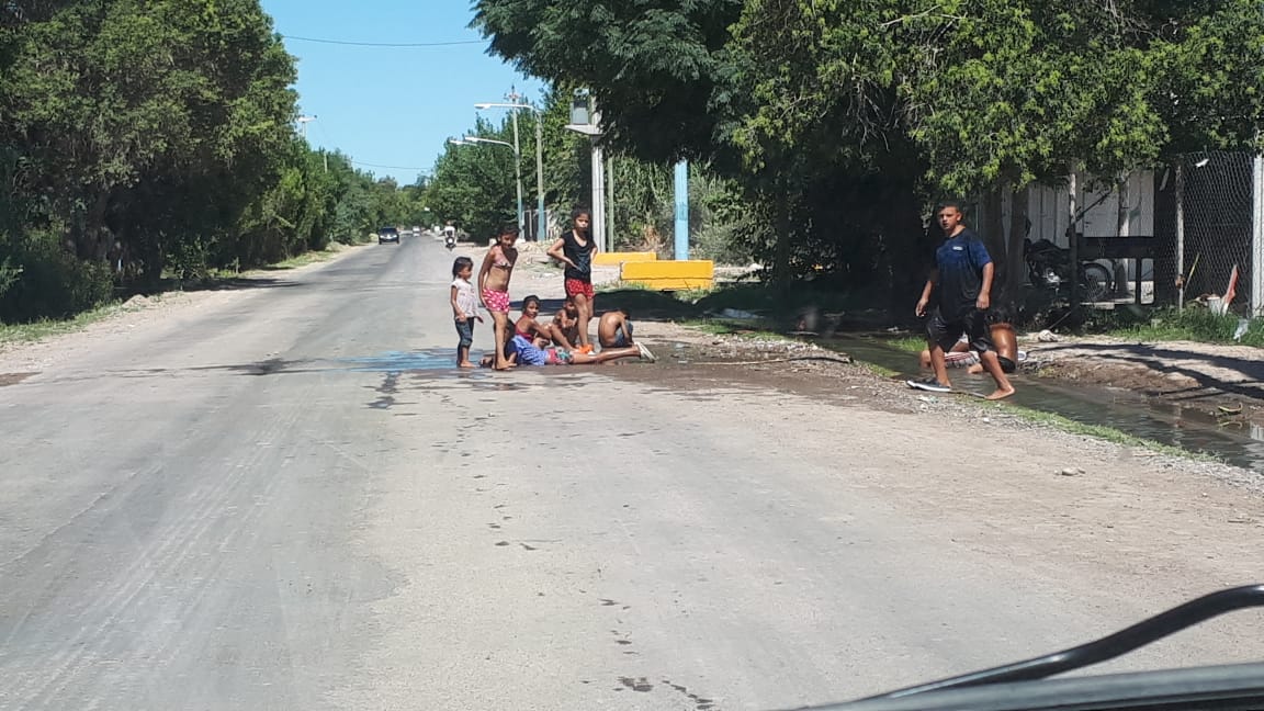 Un lector envió una imagen y el siguiente comentario: "Niños ocupando media calzada para tomar sol mientras se bañan en canal, sin supervisión de nadie. Esto fue este lunes en Calle 12 entre Aberastain y Mendoza, en Pocito".