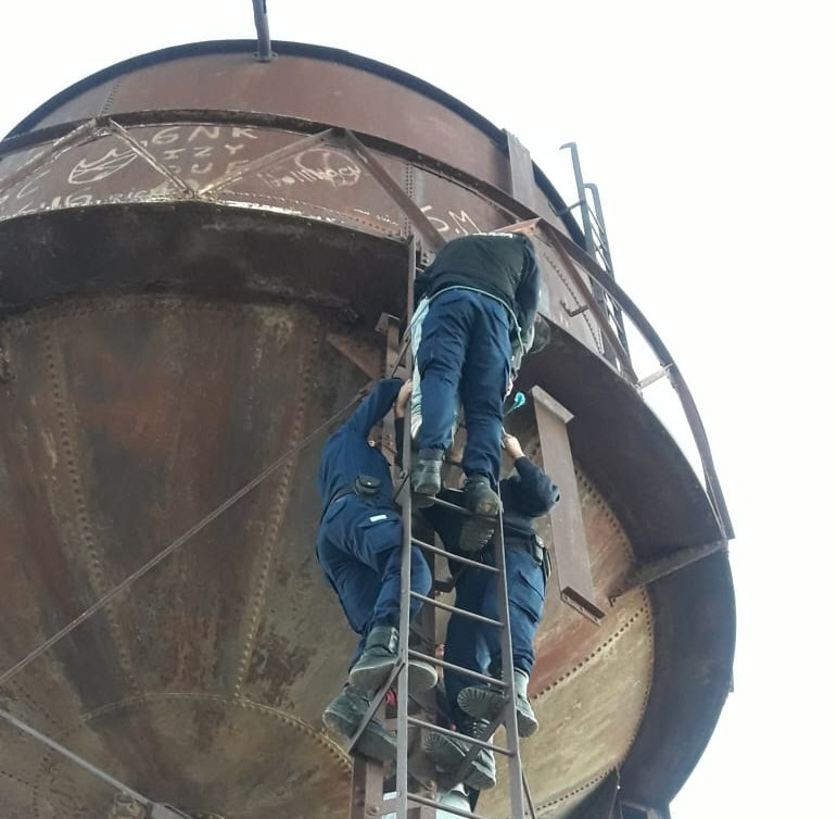 Un hombre que aparentemente amagaba con quitarse la vida fue rescatado por personal de la seccional 21ra de Jáchal al quedar colgando de una mano desde un tanque de agua. El sujeto, que sufre de epilepsia, estaba arriba de ese tanque en la estación del exferrocarril Belgrano. Tras sufrir un ataque de epilepsia, tuvo que ser rescatado por los policías, que lo sujetaron con cuerdas y sus propios cuerpos para bajarlo sano y salvo.