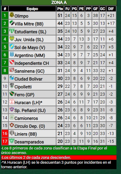 Quien complicó aún más su presente es Desamparados, que en esta fecha quedó libre y que, con los resultados puestos, quedó en la última posición. Es que Liniers de Bahía Blanca empató de local 0 a 0 ante Juventud Unida, además Círculo Deportivo Nicanor Otamendi venció 2 a 1 a Ferro de Pico y también escaló. Camioneros, próximo rival del Víbora en San Juan, volvió a la victoria después de ocho encuentros y venció este sábado a Cipolletti por 1 a 0. Entre otros resultados, Huracán Las Heras cayó ante Sol de Mayo por 3 a 1, mientras que el líder Olimpo venció 1 a 0 a Ciudad Bolívar e Independiente de Chivilcoy derrotó 2 a 1 a Sansinena. El viernes por la noche, Villa Mitre se impuso por 1 a 0 ante Estudiantes en San Luis.