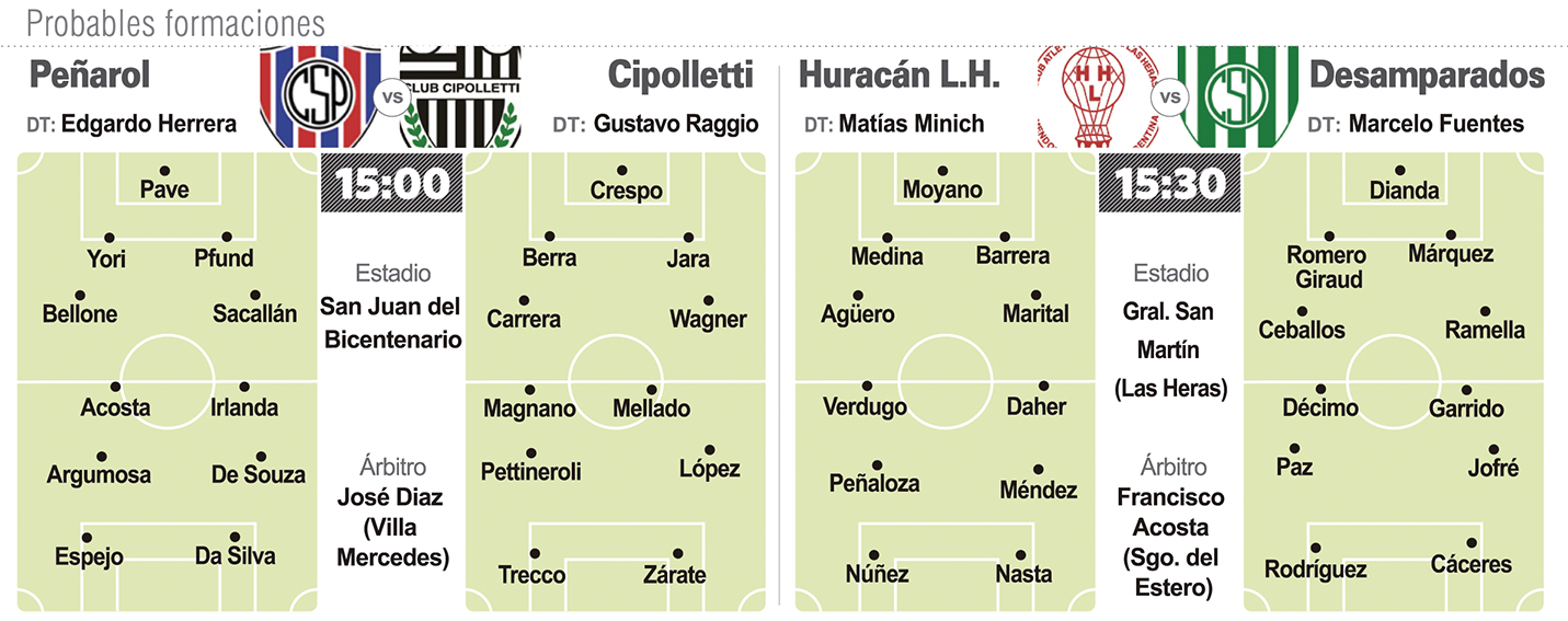 Apenas un punto por encima del Bohemio está Desamparados, que visitará a las 15.30 a Huracán Las Heras en Mendoza con la urgencia de conseguir una victoria que le permita retomar la confianza. Su técnico Marcelo Fuentes ya sumó un empate en el debut ante Camineros pero recién esta semana pudo completar su primer agenda de entrenamientos que fue intensa desde lo físico y con mucho hincapié en lo táctico. Una sola variante mostrará con respecto a la igualdad 0 a 0 de hace una semana y será el retorno de su goleador Julio Cáceres quien ya cumplió las 2 fechas de suspensión y reemplazará a Lucas Dilelio. Lo demás no variará y solo habrá un movimiento de piezas con Fede Paz ahora jugando por el carril derecho y el Peca Jofré yendo por el izquierdo. Arriba volverá la dupla de los "tanques" con el tandem Rodríguez-Cáceres.