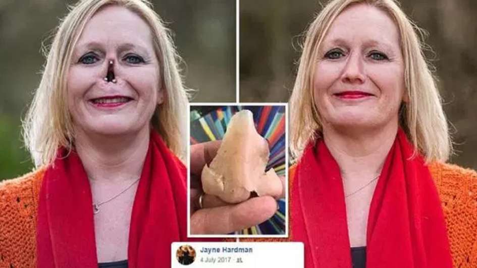 Una británica que se quedó sin nariz luego del ataque de un perro, ahora luce una impactante prótesis removible en su cara. Jayne Hardman (48) se animó a mostrarse frente al mundo y revelar su mayor secreto facial. En marzo de 2012 sufrió el peor episodio de su vida. Un perro callejero saltó y la golpeó en la cara, dejándola seriamente lesionada y con una extraña enfermedad mortal.