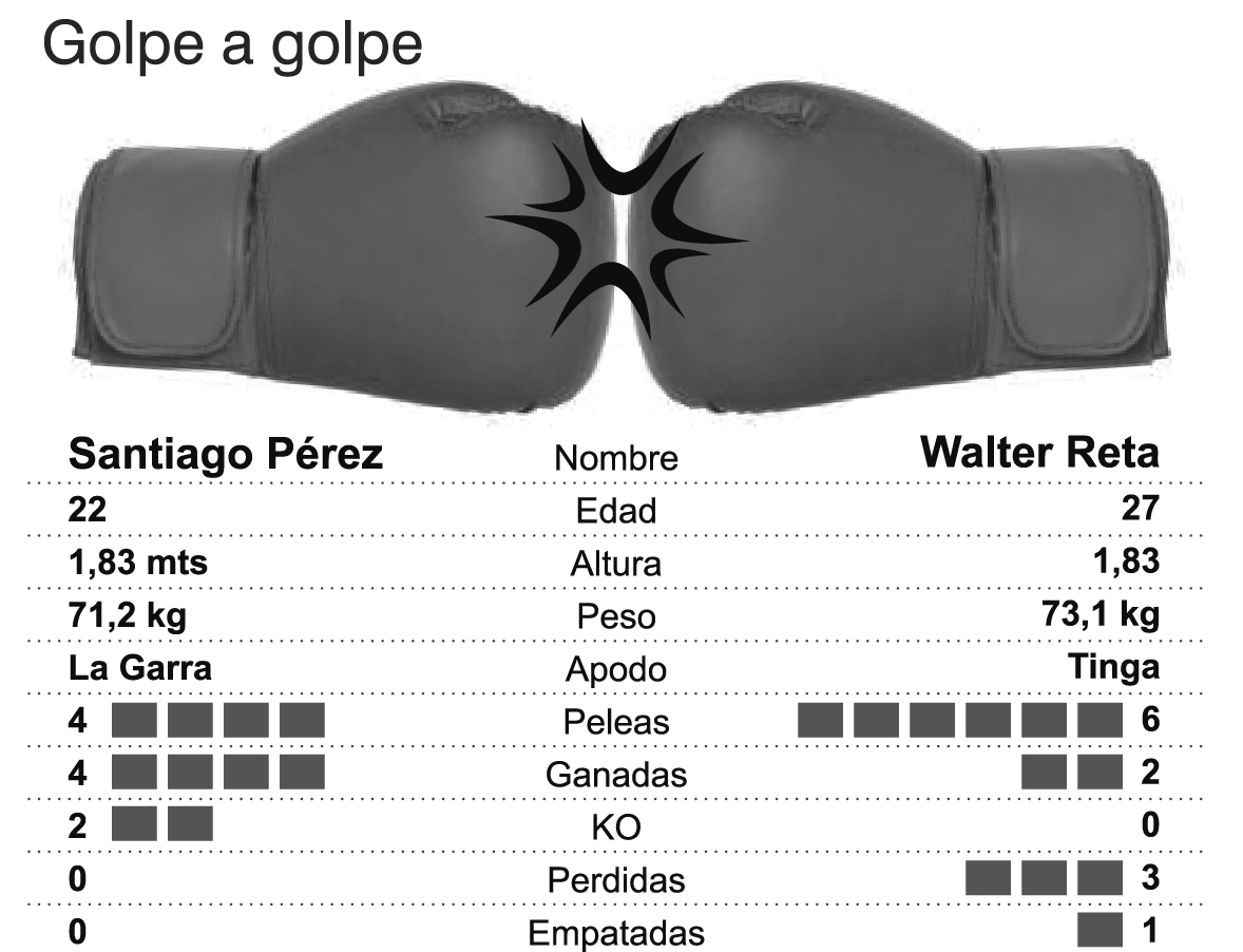 “La Garra” Pérez se sale de la vaina para pelear y no le dio mucha bolilla al tema del peso, pero su entrenador Mario Cabello le solicitó a quien lo acompañaba, Javier Chacón (hermano de Pablo el ex campeón mundial pluma) que lo hiciera bajar medio kilo y propuso la diferencia de guantes. Pérez subirá al cuadrilátero con guantes de 8 onzas y Reta lo hará con guantes de 10 onzas.
