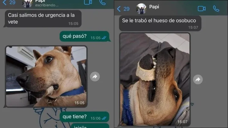 La joven, que no se encontraba en el lugar del acontecimiento en ese momento, no entendía qué pasaba. Al ver la foto, le preguntó a su familiar a cargo que es lo que tenía el perro en la boca. Como respuesta, su padre le contó que al pobre canino se le había trabado el hueso del osobuco y procedió a enviarle una imagen donde el obstáculo se veía mejor.