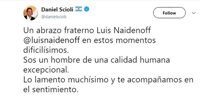 También el líder del Frente Renovador y diputado nacional Sergio Massa envió "un profundo abrazo" al senador Naidenoff y a toda su familia "en este momento tan doloroso".