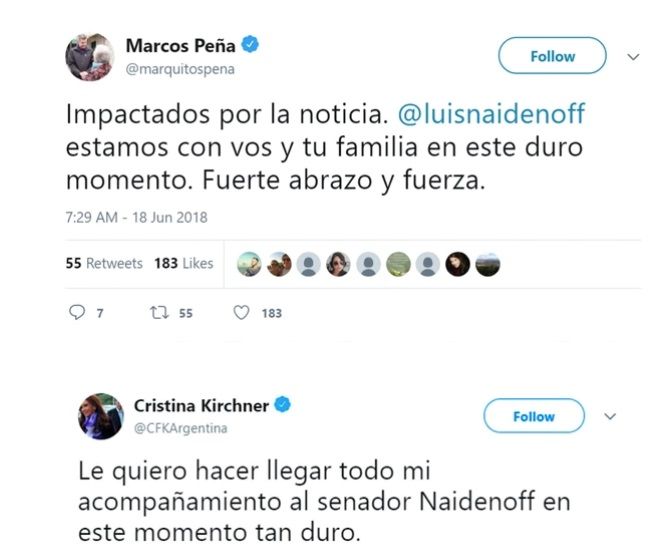 Una de ellas fue la de la expresidenta y actual senadora nacional Cristina Fernández de Kirchner, quien transmitió, también a través de Twitter, su "acompañamiento" a Naidenoff "en este momento tan duro".