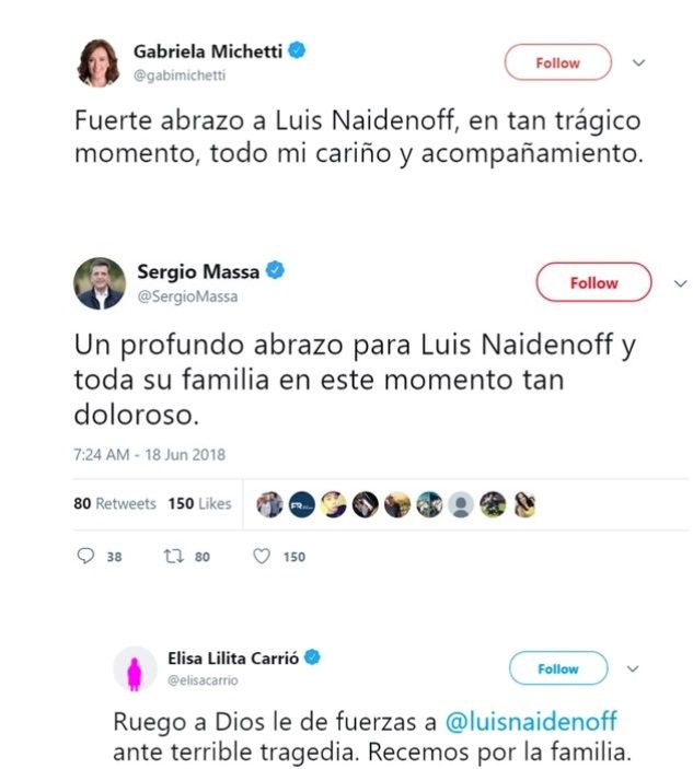 Mientras que, la vicepresidenta Gabriela Michetti expresó su "cariño y acompañamiento" a la familia del formoseño. "Fuerte abrazo a Luis Naidenoff, en tan trágico momento, todo mi cariño y acompañamiento", escribió.