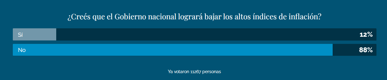 "¿Creés que el Gobierno nacional logrará bajar los altos índices de inflación’", fue la consulta realizada. La pregunta fue respondida por más de 11 mil personas y el 88 por ciento opinó que "No". Mientras que, sólo el 12 por ciento consideró que la inflación puede descender.