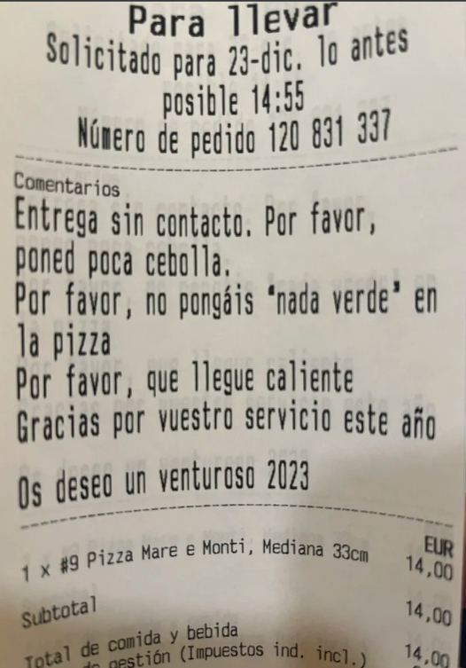 ”Entrega sin contacto. Por favor, poner poca cebolla. Por favor, no pongan nada verde en la pizza. Por favor, que llegue caliente”, anotó el cliente.