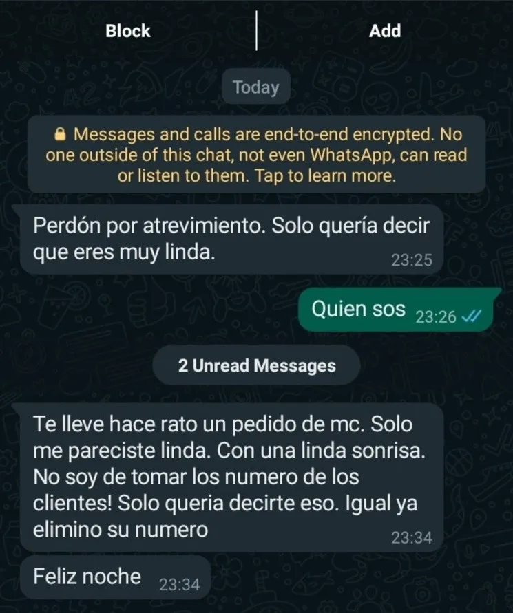 “Te llevé hace un rato un pedido de mc. Solo me pareciste linda. Con una linda sonrisa. No soy de tomar los números de los clientes! Solo quería decirte eso. Igual ya eliminó su número”, le explicó el repartidor y por último agregó: “Feliz noche”.