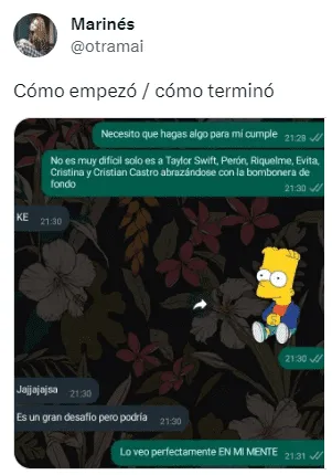 "Necesito que hagas algo para mi cumple: no es muy difícil, sólo es a Taylor Swift, Perón, Riquelme, Evita, Cristina,y Cristian Castro abrazándose con La Bombonera de fondo", se llega a leer en el mensaje de WhatsApp que Marinés le envió a un amiga diseñadora.