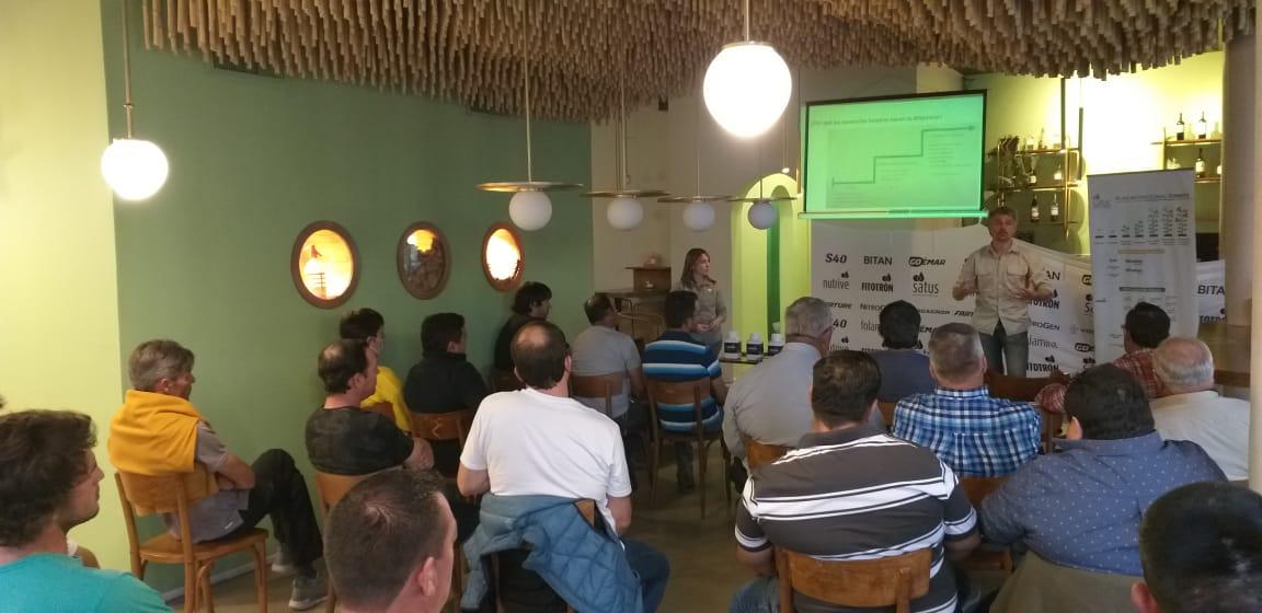 Leandro Winkelmann y Verónica Castaño, de la firma argentina, explicaron a los chacareros presentes que "es muy importante ir incorporando la fracción activa de la materia orgánica, que son los ácidos húmicos y fúlvicos como fuente principal para los planes hortícolas. Ahí verán los beneficios de la misma. Como estos aumentan la capacidad del suelo de mantener disponibles los nutrientes y de que se disponen más asimilables por la planta, generando un vínculo suelo-planta. Además, son de muy fácil aplicación".