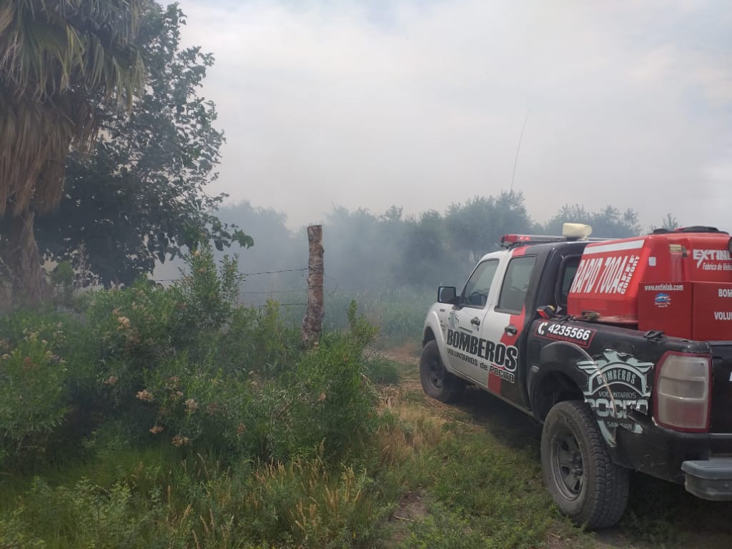 Personal de Bomberos Voluntarios de Pocito y del Cuartel Central trabajaron desde media mañana para poder combatir un feroz incendio en una finca de olivos en Calle 13 al Este de Ruta 40, en Pocito.
