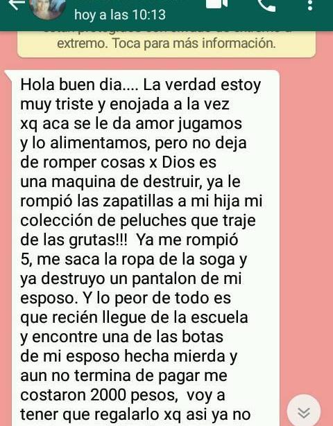 A través de mensajes, le escribió a la proteccionista para mostrarle todo lo que el animal había hecho como romper una "colección de peluches", una frazada, un zapato, una pared y lo que más llamó la atención fue "una bota de 2.000 pesos".