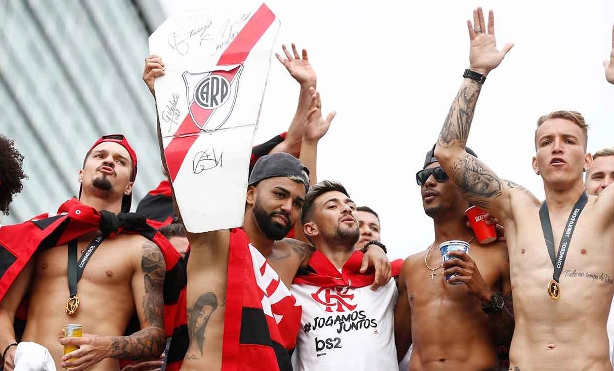 Gabigol mostró un ataúd con el escudo de River en pleno festejo con sus compañeros arriba de una tarima. Los hinchas del Fla se lo dieron y él lo levantó para las fotos.