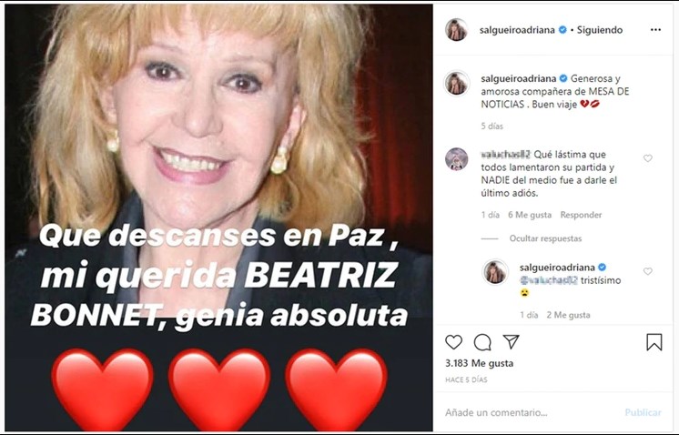 Quien rompió el silencio fue la propia Adriana Salgueiro. Y lo hizo al contestar distintos mensajes que le hicieron en aquel posteo inicial, el de su saludo a Bonnet. “Lástima que el ambiente artístico fue tan berreta que nadie la despidió como merecía -reflexionó una mujer-. Demasiado grande como para partir en la desolación absoluta. Horrible”. “Estoy de acuerdo”, coincidió Adriana, y agregó un “tristísimo”. “Los actores y actrices se muestran como una gran familia, pero es mentira… A ella la dejaron sola… Son lo más lejos del concepto de familia que hay…”, opinó otra seguidora. Y Salgueiro volvió a reconocerlo: “Es verdad”.