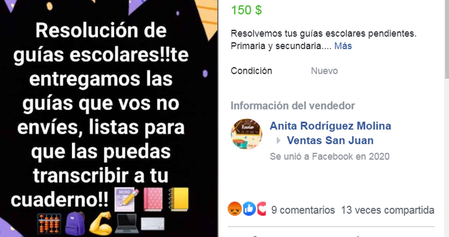 "Cansado de hacer las guías, nosotros las hacemos por vos". Esta es una de las frases con las que personas de San Juan ofrecen un servicio que generó polémica, pues cobran por resolver las tareas escolares y entregarlas listas para que el alumno sólo las transcriba a su cuaderno, sin tener que hacer ningún esfuerzo. Este servicio lo ofrecen a través de las páginas de compra y venta que hay en las redes sociales.