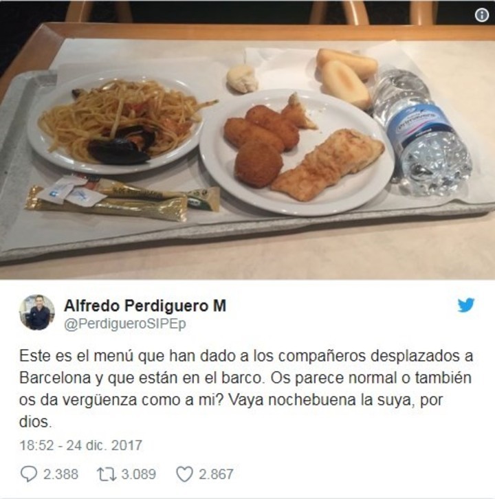 “Menú de Navidad de nuestros policías desplazados a Catalunya, defendiendo el Estado de derecho lejos de sus familias. A los delincuentes se les dispensa mejor trato”, aseguró ayer en su cuenta de Twitter el SUP en alusión al menú especial servido en la cárcel madrileña de Estremera a todos los internos, entre ellos al ex vicepresident de la Generalitat Oriol Junqueras, que constaba de consomé, merluza y un surtido de dulces navideños.