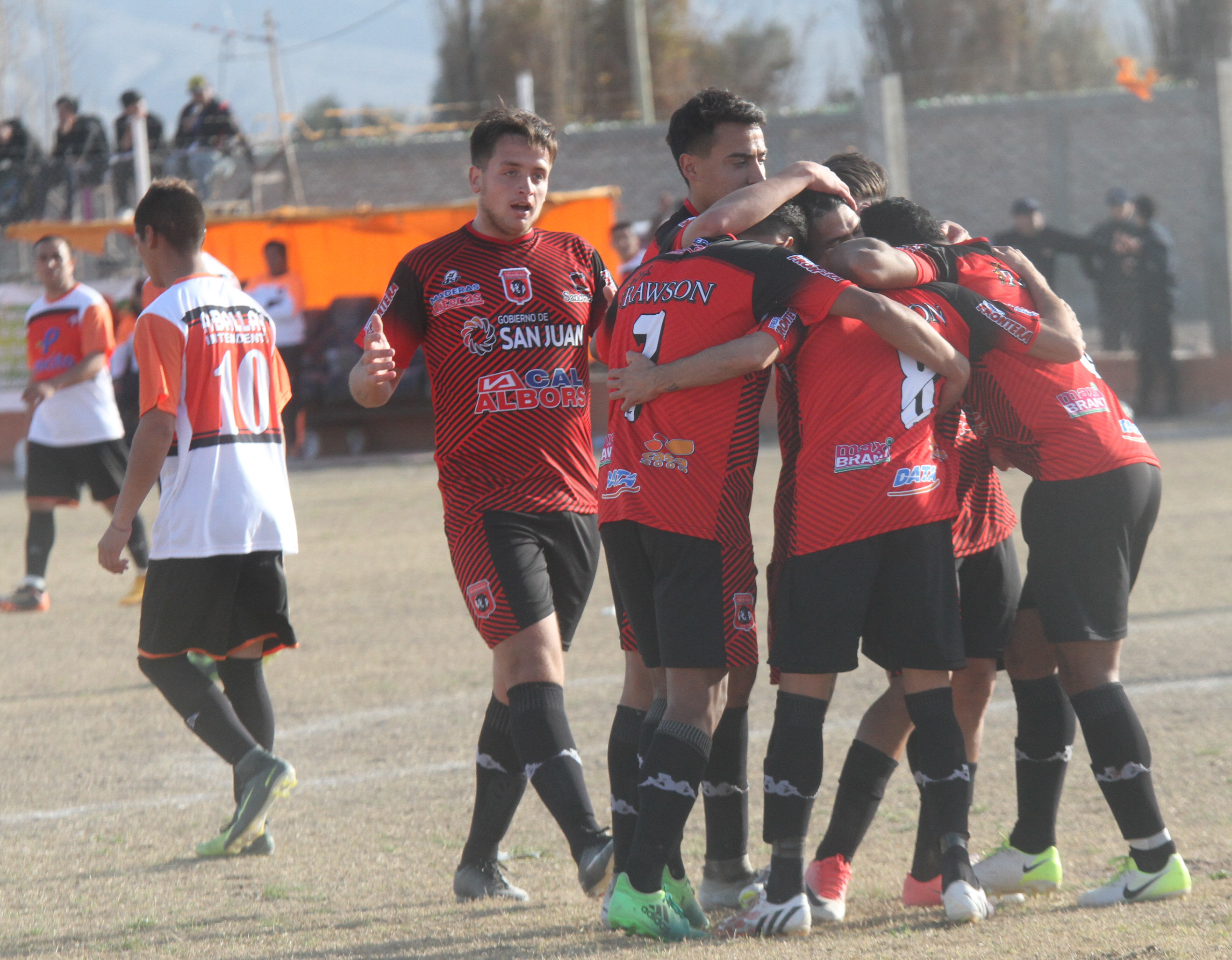 Alegría. Los jugadores de Trinidad se abrazan festejando el gol de Erick Fernández, que rompió con la racha adversa de los Leones. Gran triunfo en Pocito para salir del fondo.