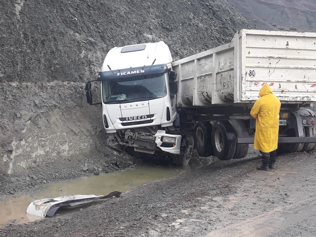 Un camión de grandes dimensiones fue protagonista de un fuerte impacto provocado por la lluvia, en Calingasta. Según las fuentes, el conductor perdió el control del gran rodado por la presencia de agua en la zona y se estrelló contra el cerro.