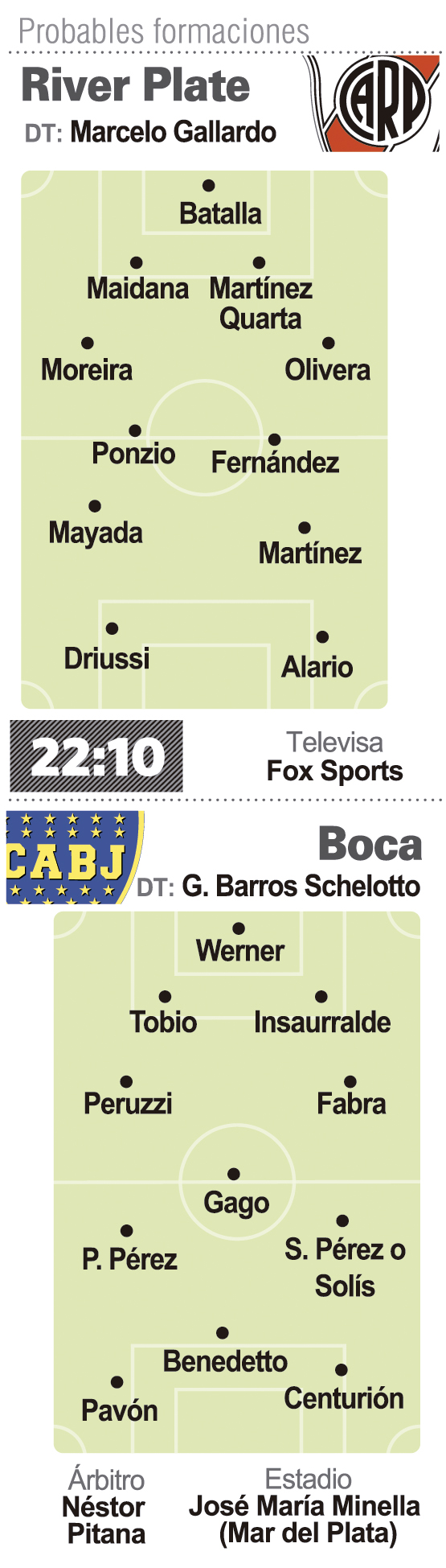 River y Boca se enfrentarán hoy en Mar del Plata con sus equipos de gala y en busca de la primera gran alegría del año, en el que será el único Superclásico del verano. Será, a diferencia de otros años, el único Superclásico estival, y comenzará a las 22.10, con arbitraje de Néstor Pitana y televisación de Fox Sports.