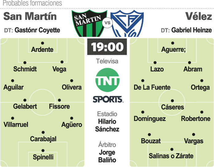 San Martín disputará esta tarde, desde las 19, su último partido de local recibiendo a Vélez, en un partido vital de la 26ta fecha de la Superliga para el equipo de Gastón Coyette, porque viene de perder el clásico ante Godoy Cruz (2-0) y porque el "Fortín" es un rival directo en los promedios. Cuatro cambios tendrá el equipo, con el regreso a la titularidad de Gustavo Villarruel luego de 6 meses tras la rotura de los ligamentos cruzados de la rodilla derecha que sufrió en la 5ta fecha ante Rosario Central.
