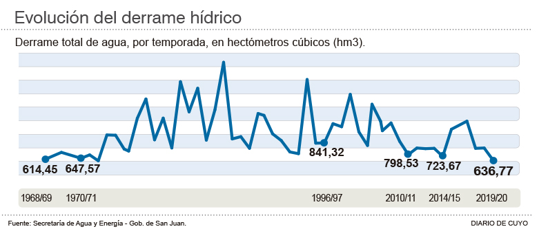 El río San Juan hizo un aporte en el período 2018-2019 de 1.050 hm3, pero hizo falta distribuir un total de 1.200 hm3. Un total de 1.096 hm3 fueron para riego y 104 hm3 para el consumo, a través de Obras Sanitarias Sociedad del Estado (OSSE). Para eso fue necesario sacarles a los tres diques un total de 150 hm3 entre octubre de 2018 y septiembre de 2019. Para el período de octubre 2019 a septiembre 2020 se estima que harán falta 630 hm3, mientras que la demanda será de 965 hm3. Por eso los diques deberán aportar 335 hm3.