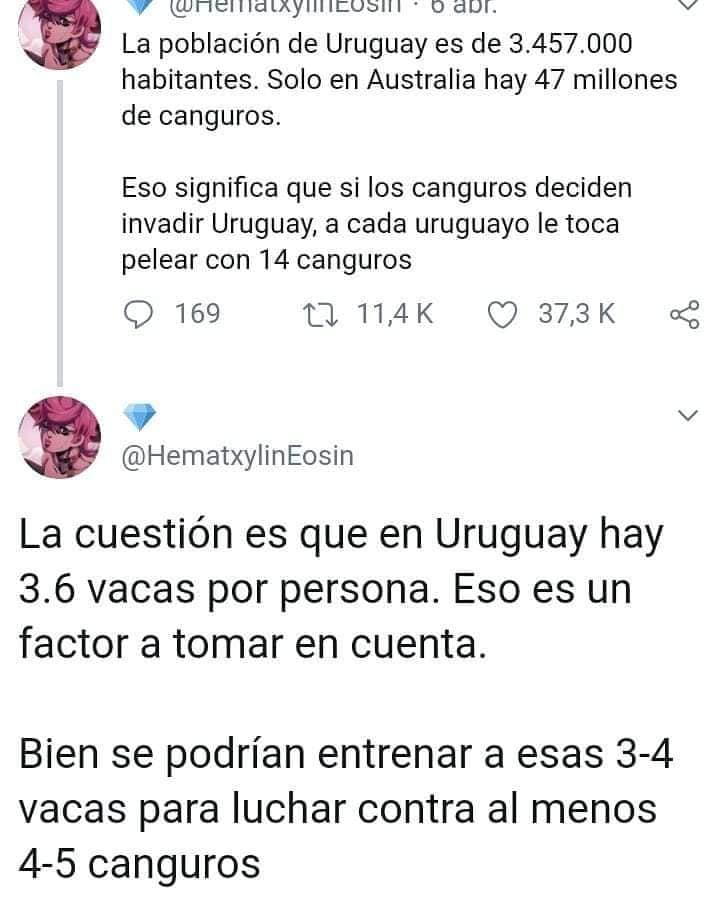 Todo comenzó con una publicación en Twitter, en la que un usuario compartió el dato, pero desde hace algunos días se está viralizando en redes sociales: en Australia hay 47 millones de canguros y en Uruguay hay 3.457.000 habitantes. La deducción que hacen es que "si los canguros deciden invadir Uruguay, a cada uruguayo le toca pelear con 14 canguros".