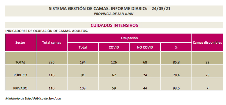 Además, se encuentran internados 276 pacientes en las áreas de COVID-19 (entre positivos y sospechosos) de los hospitales Dr. Guillermo Rawson; Dr. Marcial Quiroga; Dr. Ventura Lloveras, de Sarmiento; Dr. César Aguilar, de Caucete; Dr. José Giordano, de Albardón; Dr. Federico Cantoni, de Pocito; CEMEC; Dra. Julieta Lanteri; Hospital San Roque, de Jáchal; Hospital Dr. Alejandro Albarracín, de Valle Fértil; Hospital de Barreal, de Calingasta; Hospital Privado; Instituto Médico; Clínica El Castaño; Clínica Santa Clara; Sanatorio San Juan y CCI.