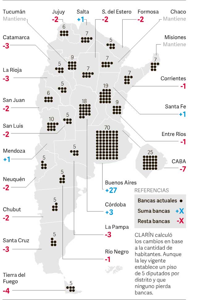 La norma introduce otros elementos. Fija, por caso, que ninguna provincia puede tener menos de 5 diputados y que tampoco puede tener, a partir de 1983, menos diputados que los que tenía al momento del golpe en 1976.