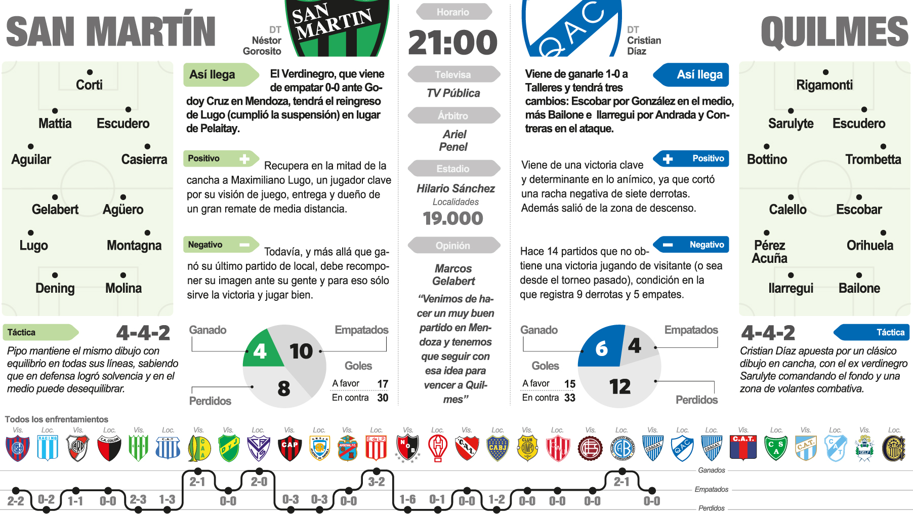 Las dos últimas presentaciones de San Martín son sus cartas positivas para encarar el partido de esta noche, ya que marcaron un quiebre en la propuesta y juego del equipo. Porque superó a Belgrano y luego igualó sin goles en el clásico cuyano ante Godoy Cruz haciendo su mejor partido. Con ello como bandera y porque logró tomar el mando de las acciones y transformarse en el principal protagonista, recibirá, desde las 21, a Quilmes en el Hilario Sánchez. Será el arranque de la 23ra fecha del Torneo de Primera División, que además tendrá el juego entre Talleres y Tigre (21.15).