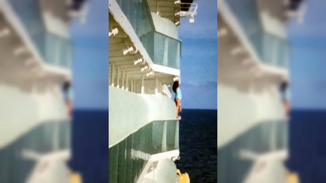 La imagen viral fue tomada por otro pasajero, Peter Blosic, cuando el crucero llegó a Falmouth, en Jamaica, informó el sitio inglés Mirror. La persona se encargó de alertar al personal del barco al ver a la mujer colgada del balcón de un camarote en uno de los niveles superiores del lujoso barco.