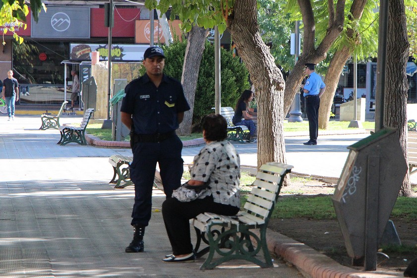 Los uniformados se encuentran en toda la ciudad. Algunos tienen barbijo y guantes, otro no; pero todos conservan la distancia a la hora de pedirle a la población que regrese a sus domicilios y cumpla con la cuarentena.