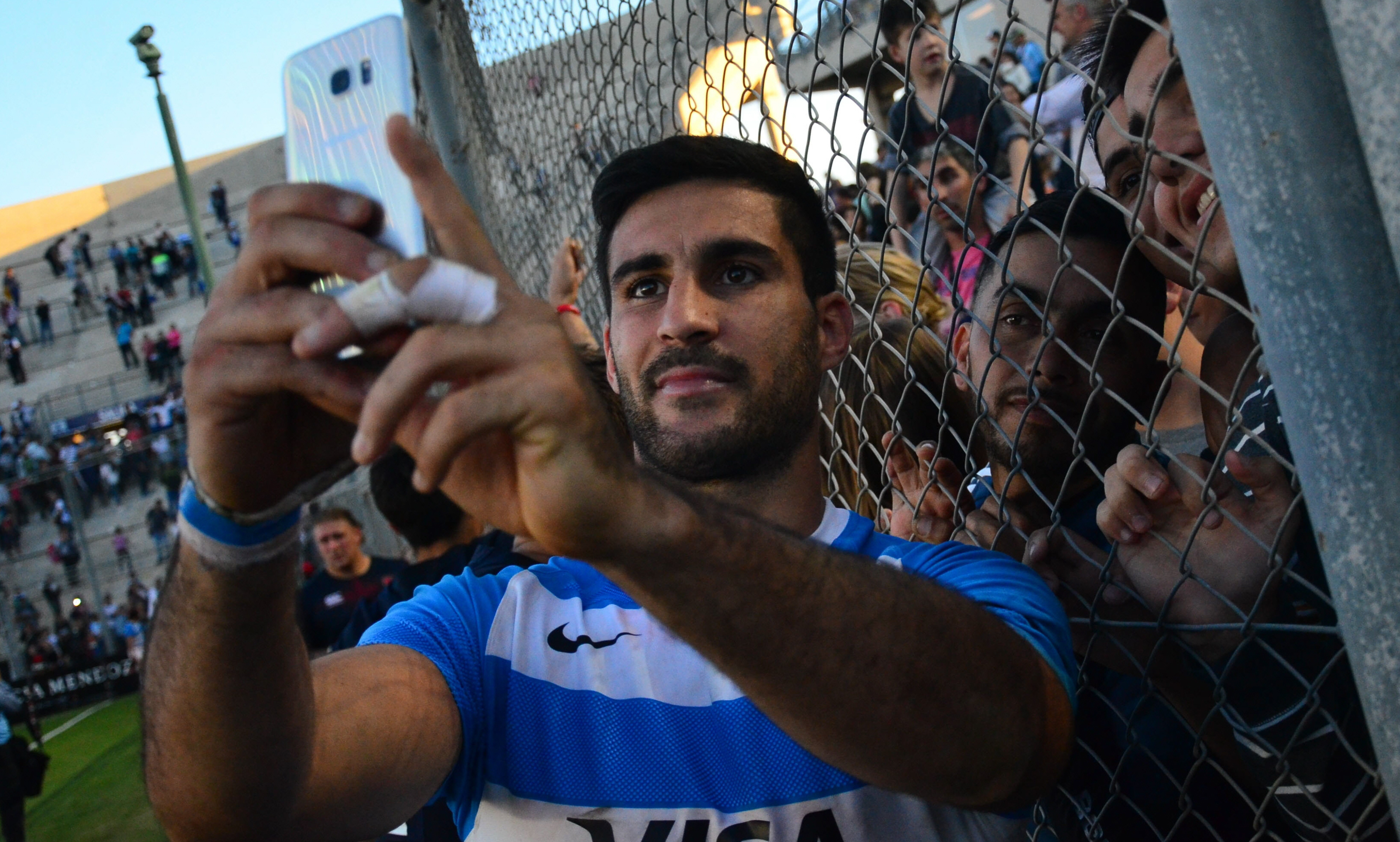 Selfie de cancha. Ramiro Moyano sintió el fanatismo sanjuanino por Los Pumas y se animó a una selfie con los espectadores, alambrado de por medio.