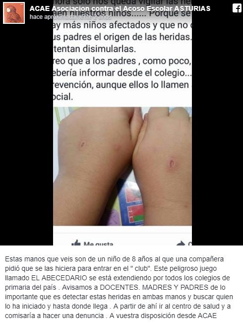 “Empezamos a ver sospechosamente que algunos niños venían con heridas en las manos. Un caso podía ser fortuito, pero cuando vimos que se empezaba a extender fue cuando decidimos llamar a los niños para que nos dijeran a qué se debían esas marcas y fue cuando nos explicaron qué era ese juego”, contó Prendes al diario local “El Comercio”.