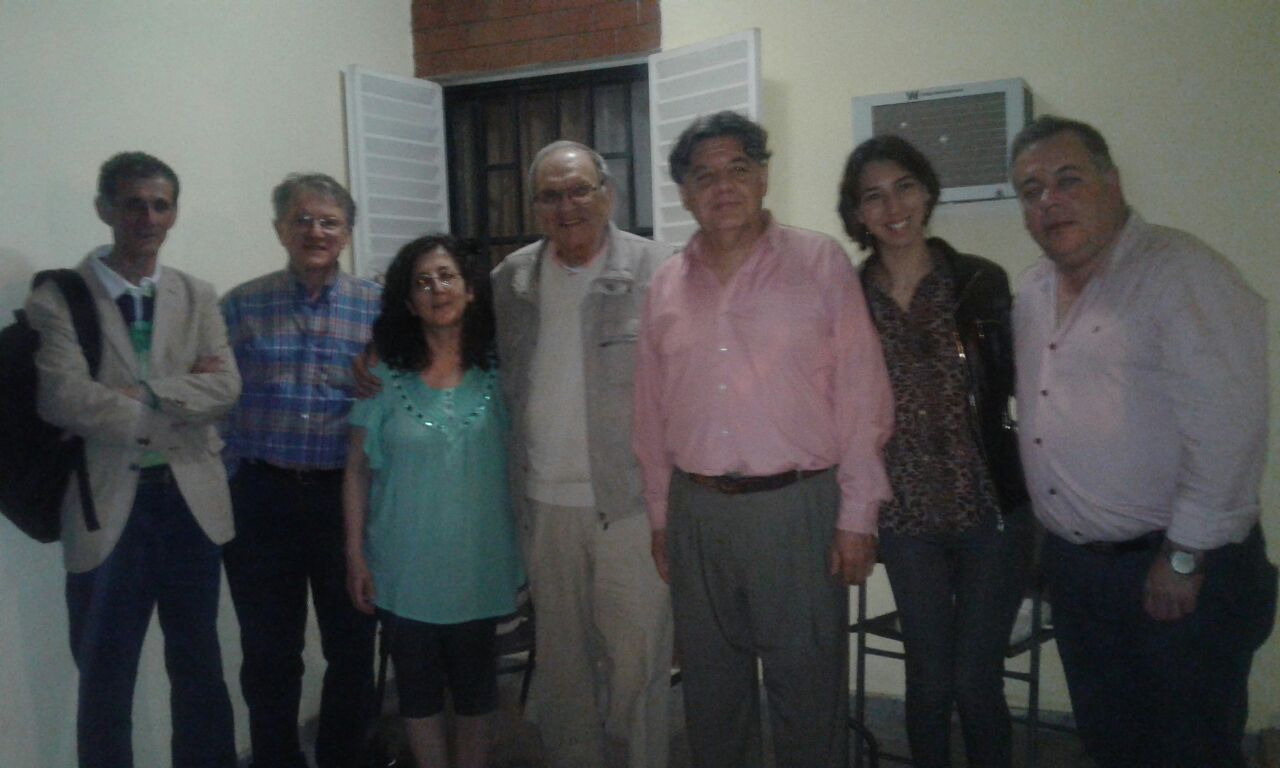 Los escritores Hugo Aguilera, José Casas, Graciela López, Jorge Pintos Rodríguez, Arturo Volantines, Marcelo Aristeo, en una cena agasajo, de la que también participó Alejandra Aristeo.