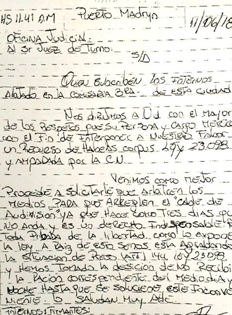 Según la nota que enviaron al Juez de turno de la oficina judicial, el cable “no funciona desde hace 3 días” y agregan que “es un derecho indispensable para toda persona privada de su libertad”.