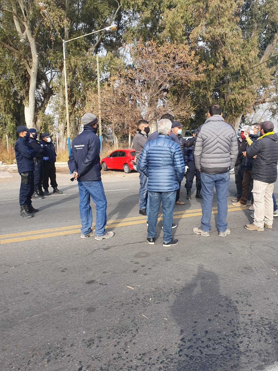 Personal policial se hizo presente en el corte que inició esta mañana para mantener las medidas sanitarias y de seguridad. Los productores cauceteros atravesaron sus vehículos en medio de la Ruta 20 y sostienen que mantendrán la medida hasta que se les permita circular y repartir sus productos.